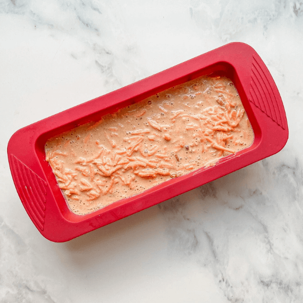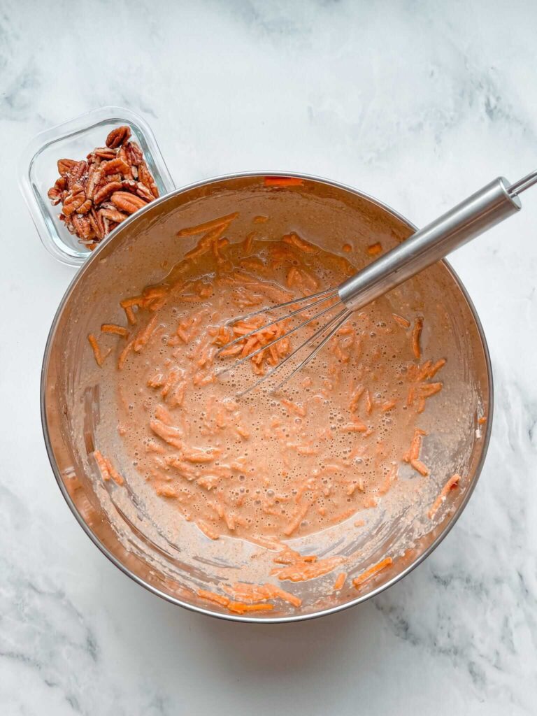 2. Schäle die Karotten und rasple sie fein. Verrühre alle Zutaten für den Teig bis auf die Pekannüsse zu einer gleichmäßigen Masse.