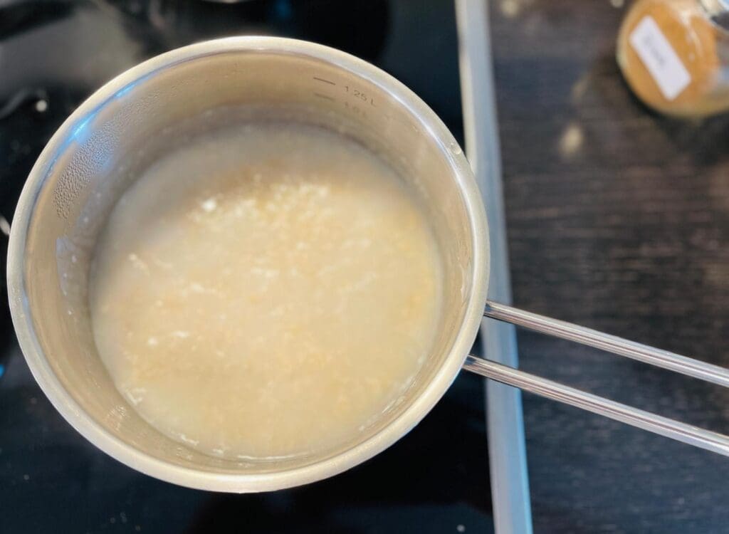 - Haferflocken und Milch in einem Topf erhitzen, Chiasamen und Zimt hinzufügen.